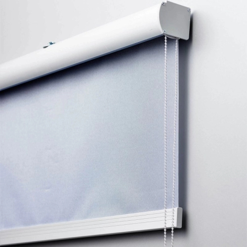 This blind doesn't have a fascia (cover at the top) and the shades are quiet when rolling it up.